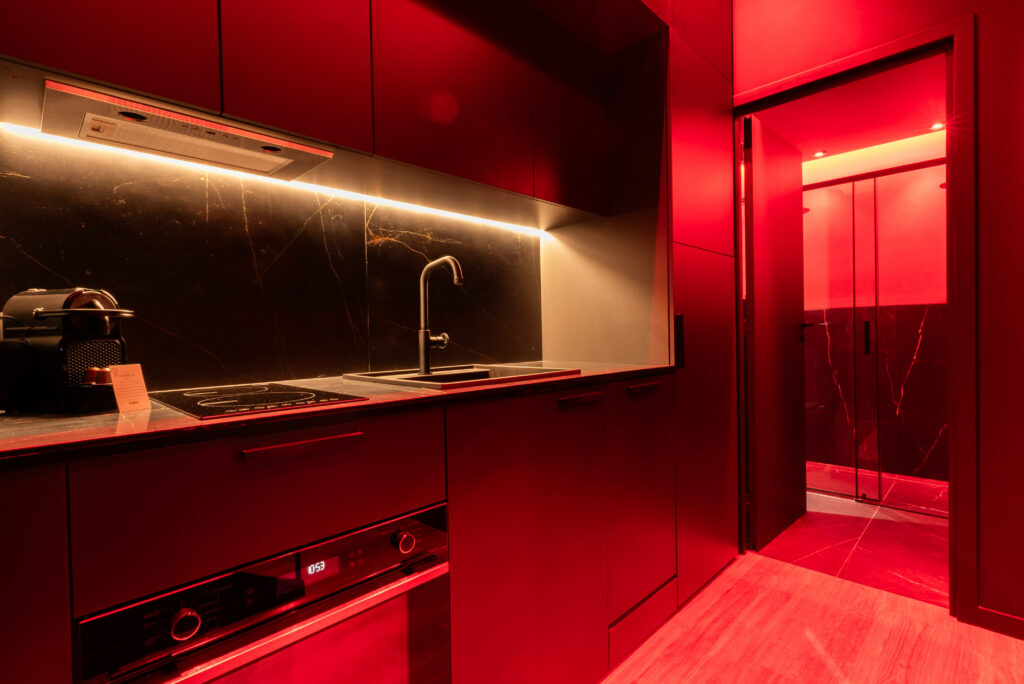 Une chambre BDSM dans les Alpes-Maritimes correspond généralement à une love room renforcée. Elle propose une ambiance immersive (lumière tamisée, miroirs, décoration rouge et noire) et intègre certains équipements dédiés comme une croix de Saint-André murale, un banc BDSM (spanking bench), des points d’attache au lit ou une petite cage décorative. Ce type d’hébergement convient aux couples souhaitant explorer le bondage ou la domination dans un cadre confortable, sans basculer dans un univers entièrement spécialisé.