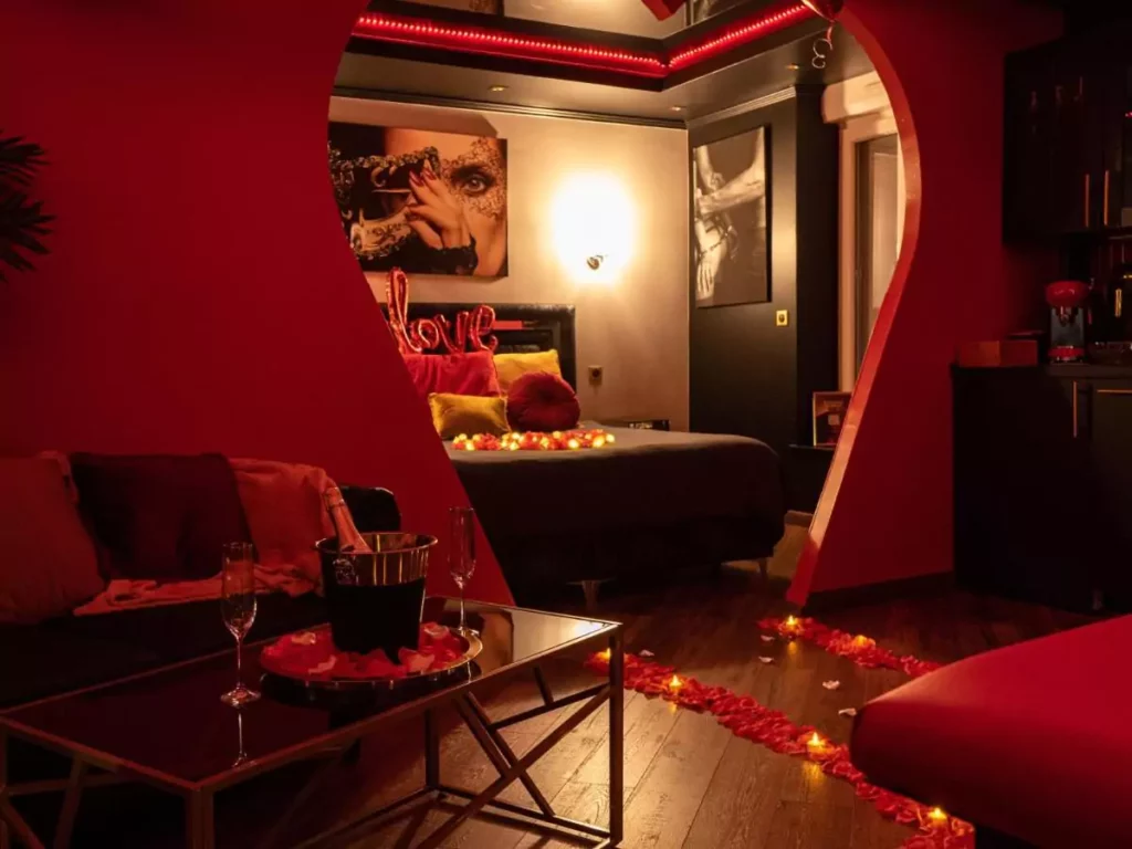 Une chambre BDSM dans le Grand Est correspond généralement à une love room renforcée. Elle propose une ambiance immersive (lumière tamisée, miroirs, décoration rouge et noire) et intègre certains équipements dédiés comme une croix de Saint-André murale, un banc BDSM (spanking bench), des points d’attache au lit ou une petite cage décorative. Ce type d’hébergement convient aux couples souhaitant explorer le bondage ou la domination dans un cadre confortable, sans basculer dans un univers entièrement spécialisé.