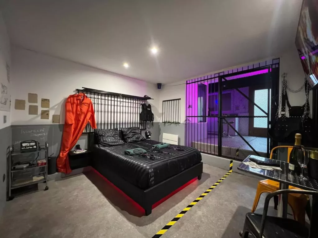 Une chambre BDSM en Seine-et-Marne correspond généralement à une love room renforcée. Elle propose une ambiance immersive (lumière tamisée, miroirs, décoration rouge et noire) et intègre certains équipements dédiés comme une croix de Saint-André murale, un banc BDSM (spanking bench), des points d’attache au lit ou une petite cage décorative. Ce type d’hébergement convient aux couples souhaitant explorer le bondage ou la domination dans un cadre confortable, sans basculer dans un univers entièrement spécialisé.